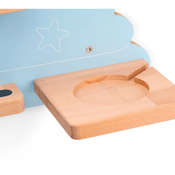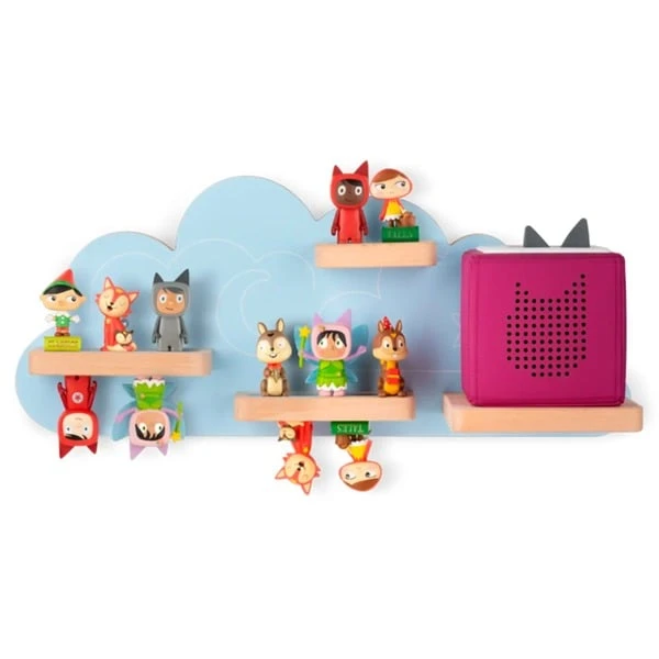 Das Tonie Regal „Auf der Traumwolke“ in der Farbe Himmelblau ist die perfekte Bühne für die Tonie-Sammlung. Dabei ist es viel mehr als ein dekoratives Wandregal: Es ist eine moderne Bibliothek, die entworfen wurde, um die Lieblings-Tonies, die Toniebox und ihre Ladestation unterzubringen. Auf der himmelblauen Wolke ruhen die liebsten Einschlafhilfen wohl behütet, bevor sie ihren Besitzer ins Träumeland begleiten. Süße Motive aus der Tonie-Welt machen den bezaubernden Blickfang zum einzigartigen Hingucker in jedem Kinderzimmer. Bis zu 20 Tonies stehen oder hängen sicher auf den magnetischen Holzflächen. Die Toniebox hat ihren eigenen Platz mit Öffnung und Vertiefung für ihre Ladestation. Das Regal lässt sich schnell und einfach an der Wand montieren, die passenden Schrauben und Dübel sind dabei.Art.-Nr.: 1918276