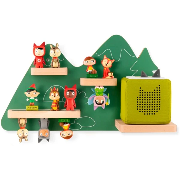 Das Tonie Regal „Auf zum magischen Berg“ in der Farbe Waldgrün ist die perfekte Bühne für die Tonie-Sammlung. Dabei ist es viel mehr als ein dekoratives Wandregal: Es ist eine moderne Bibliothek, die entworfen wurde, um die Lieblings-Tonies, die Toniebox und ihre Ladestation unterzubringen. Auf dem waldgrünen Berg steht eines auf jeden Fall fest: Die Expeditioncrew des Hör-Spiel-Spaßes. Süße Motive aus der Tonie-Welt machen den bezaubernden Blickfang zum einzigartigen Hingucker in jedem Kinderzimmer. Bis zu 20 Tonies stehen oder hängen sicher auf den magnetischen Holzflächen. Die Toniebox hat ihren eigenen Platz mit Öffnung und Vertiefung für ihre Ladestation. Das Regal lässt sich schnell und einfach an der Wand montieren, die passenden Schrauben und Dübel sind dabei.Art.-Nr.: 1918275